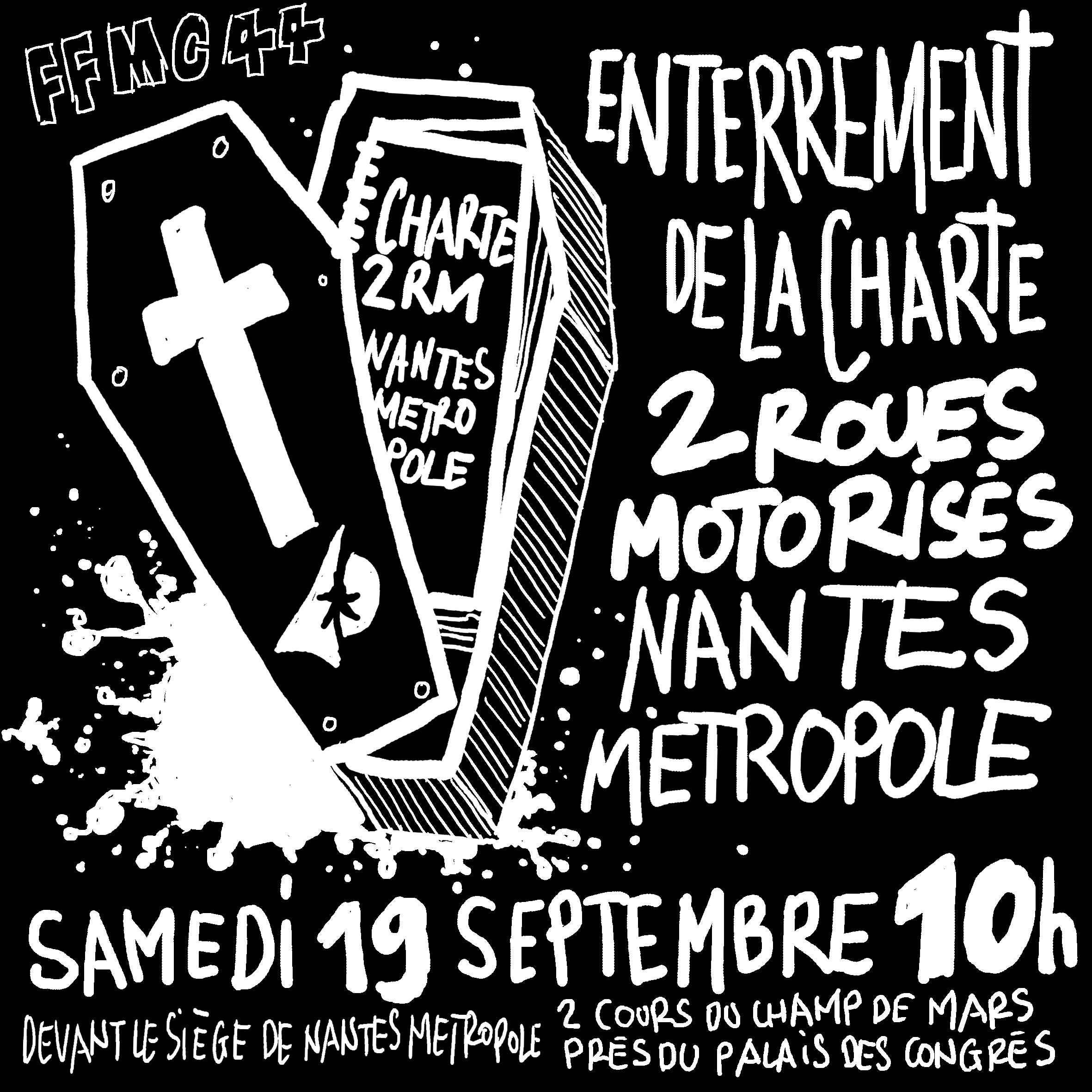 Samedi 19 septembre 2015, la FFMC 44 organise une action « Enterrement de la Charte des deux-roues motorisés » et appelle les motards et scootards à nous rejoindre.