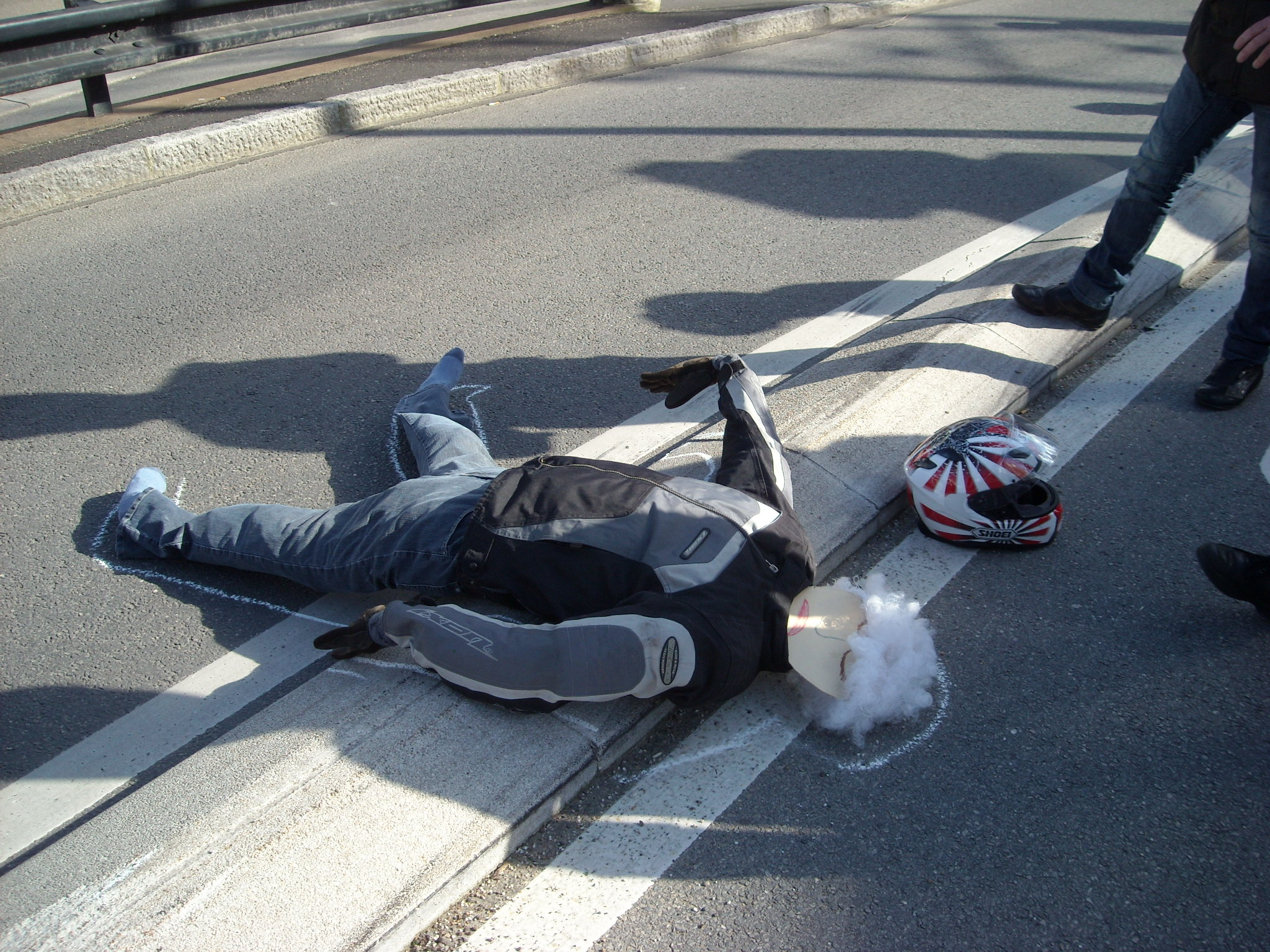 Un mannequin motard a été jeté au sol, puis son contour a été tracé avec de la peinture blanche.