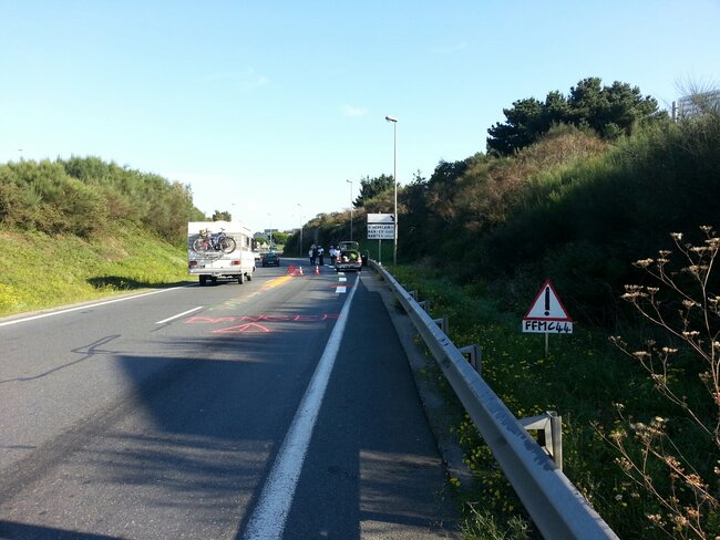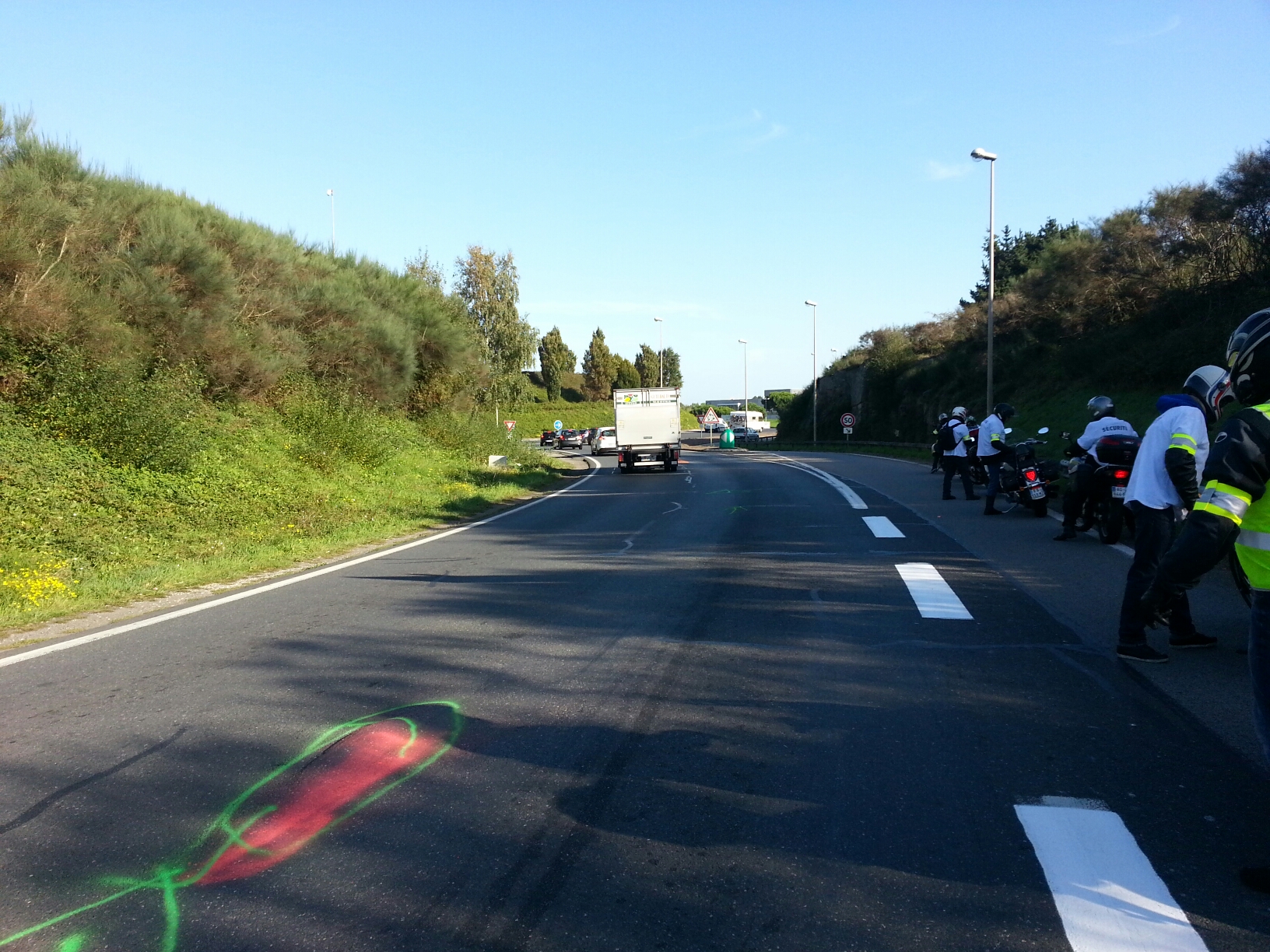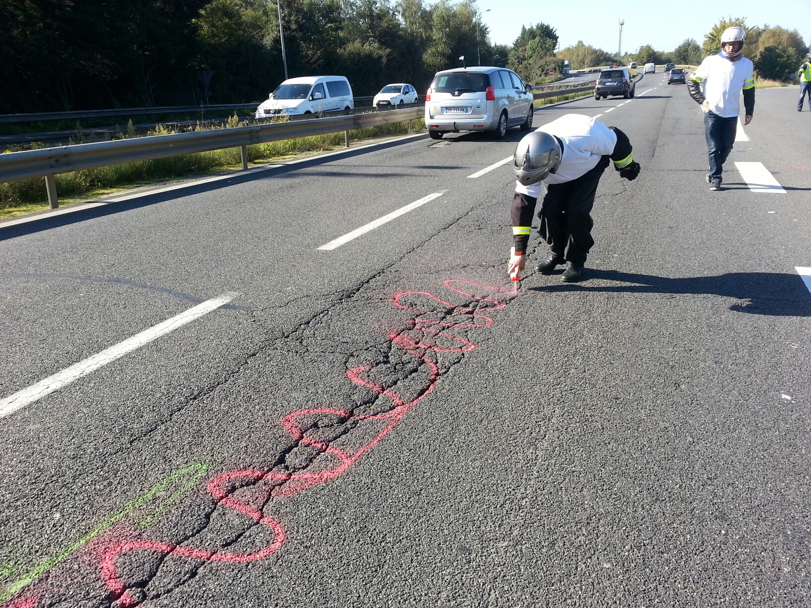 La FFMC 44 avec une dizaine de militants a organisé samedi 26 septembre 2015, matin, une action de signalement de diverses dégradations de la chaussée du périphérique nantais à l’aide de peinture (traceur de chantier) et de panneaux de DANGER.
