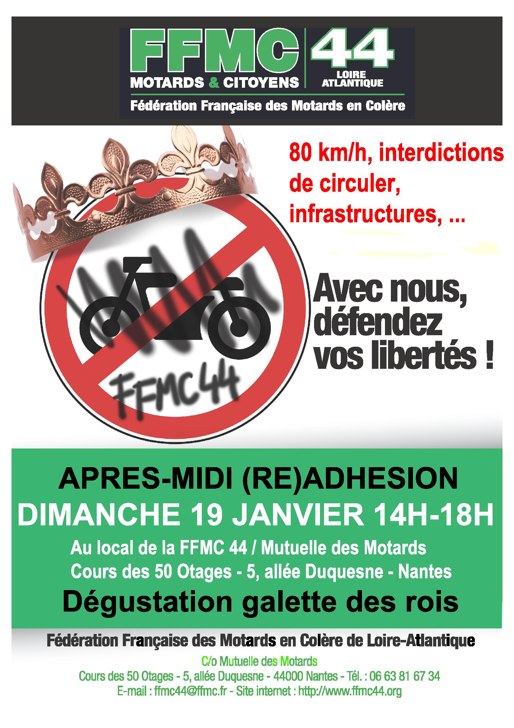 La FFMC 44 organise sa traditionnelle APRES-MIDI (RE)ADHESION dimanche 19 janvier 2020, de 14H00 à 18H00 à son local, Cours des 50 Otages - 5, allée Duquesne à Nantes (agence Mutuelle des Motards).