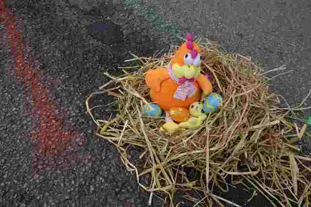 Soyez actifs, soyez imaginatifs … repérez un nid-de-poule, décorez-le et photographiez le ainsi décoré (paille, œufs, poule, …).