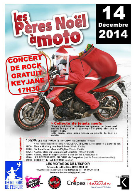 L’idée est de faire une petite virée le dimanche 14 décembre 2014 avec des motards et motardes tous déguisés en Mères & Pères Noël pour animer un peu les centres villes de l’agglomération nantaise et de NANTES.