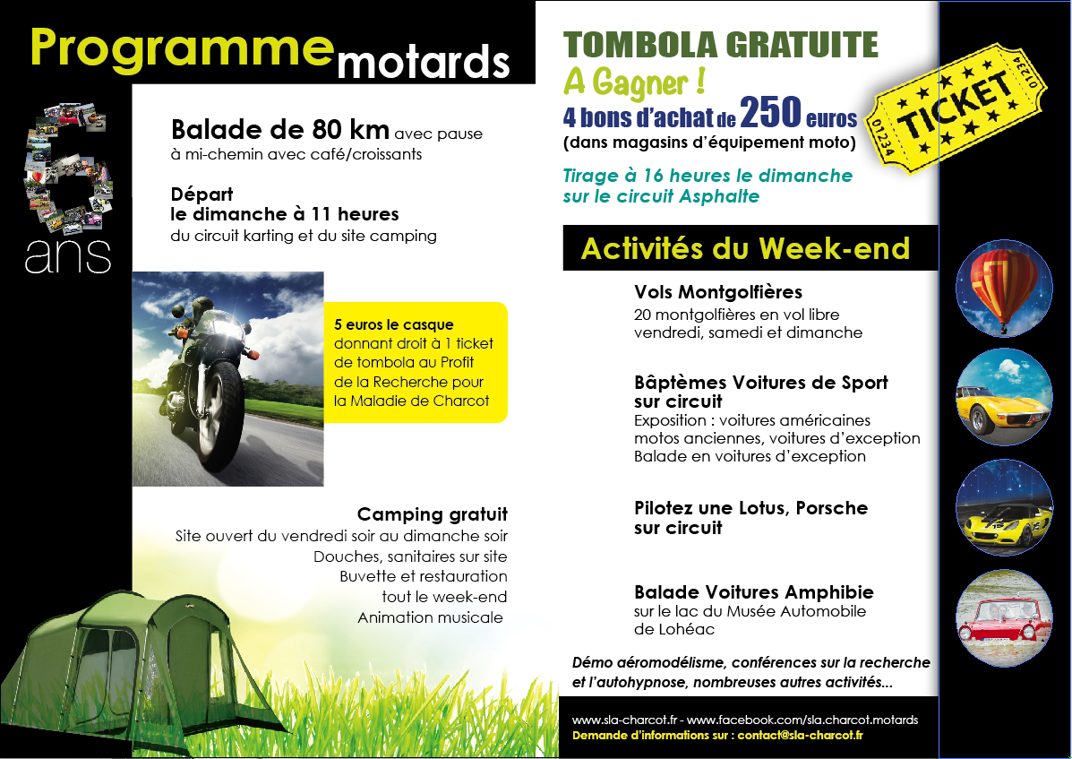 Vous trouverez tout le programme sur les flyers, sur le site ici et sur facebook : https://www.facebook.com/sla.charcot.motards
