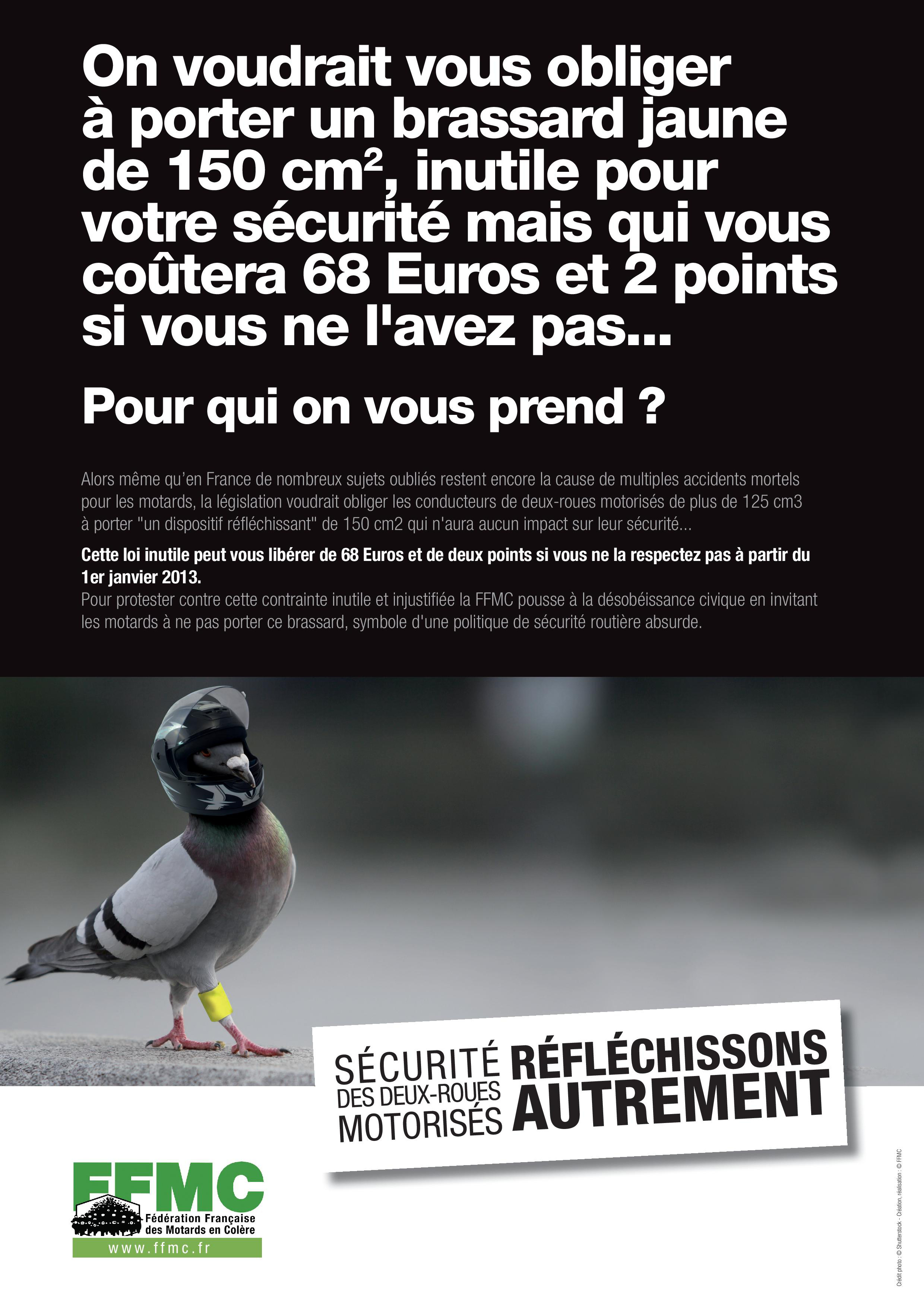 L’obligation pour les motards de porter une dispositif rétro-réfléchissant arrive à grands pas ; la FFMC s’y oppose farouchement. Dès le 1er janvier 2013 (dans à peine 2 mois !), les conducteurs et passagers d’un deux-roues motorisé de plus de 125 cm3 devront porter un dispositif rétro-réfléchissant d’une surface minimale de 150 cm2. Une obligation qui se traduira pour la plupart des motards par le port d’un brassard si leurs vestes et blousons ne sont pas déjà pourvus d’une surface réfléchissante, ou si elle est insuffisante.