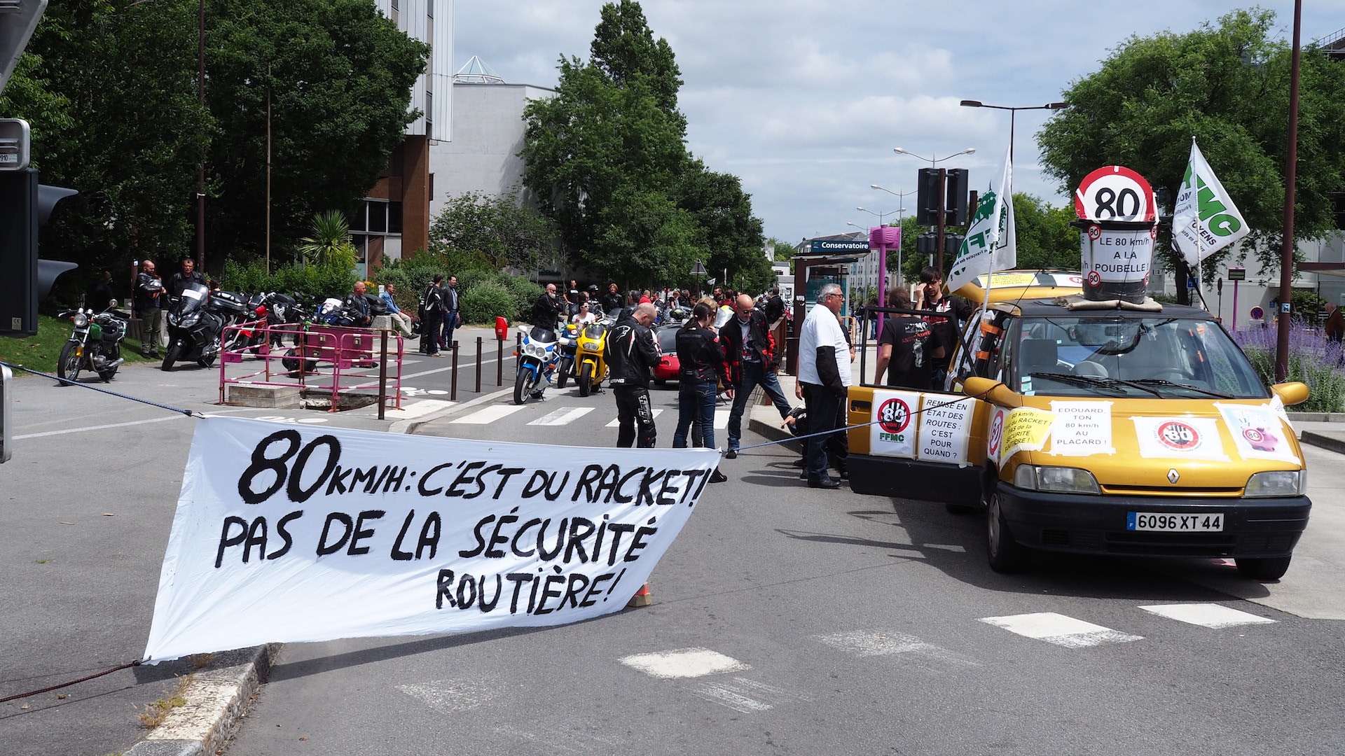 A l’appel de la Fédération Française des Motards en Colère de Loire-Atlantique (FFMC 44) et de 40 Millions d’Automobilistes, motards et automobilistes, se sont rassemblés une nouvelle fois rue Gaëtan Rondeau à Nantes en début d’après-midi pour demander le retrait du 80 km/h et la mise en place d’une vraie politique de sécurité routière (infrastructures, éducation, formation, prévention, …).