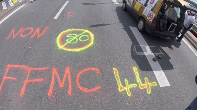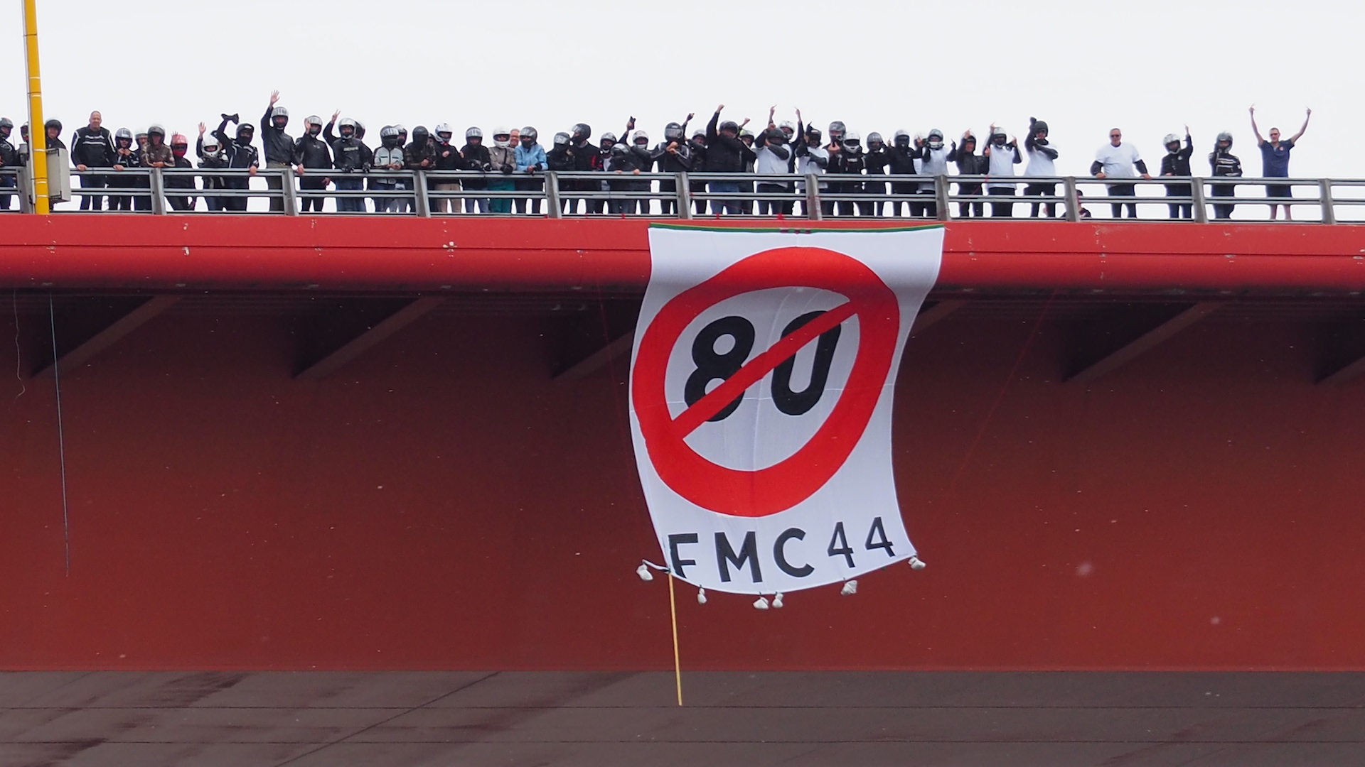Une grande banderole (80 barré) de 5 m X 6 m a été fixée sur le pont. Haute et grande comme la colère des usagers de la route toujours opposés au 80 km/h.