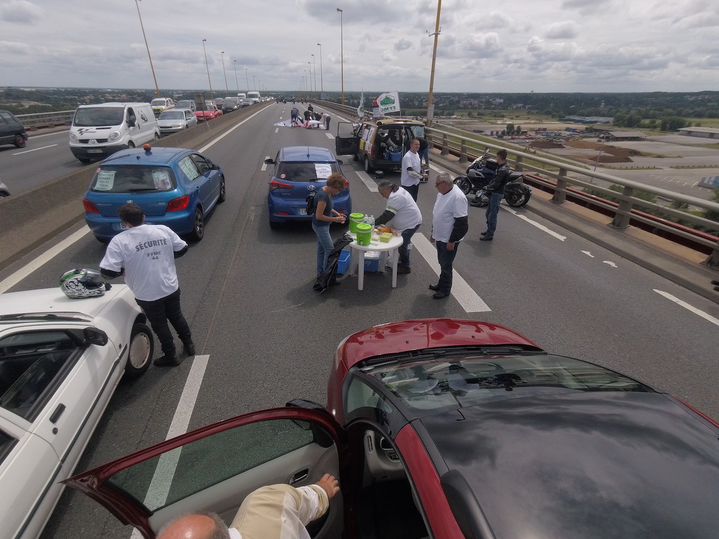 Motards et automobilistes ont bloqué pendant 1 heure le pont de Cheviré dans le sens Nord-Sud (périphérique) en s’arrêtant sur l’ouvrage. Ce fût l’occasion de faire une pause café en haut du pont.