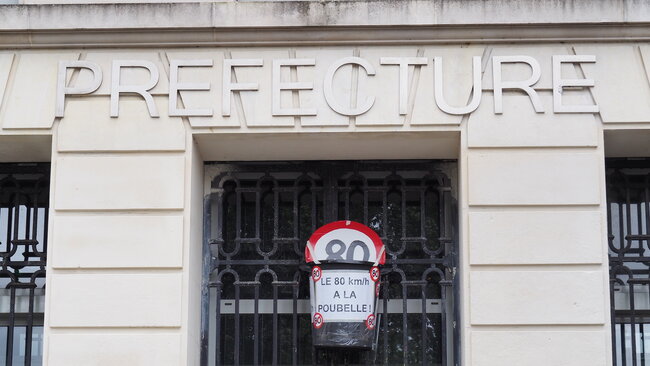 La manifestation s’est terminée devant la Préfecture où une poubelle - la vraie place du 80 km/h - promenée tout au long de la manif. a été accrochée aux grilles du bâtiment.
