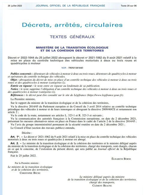 Décret n° 2022-1044 du 25 juillet 2022 abrogeant le décret relatif à la mise en place du contrôle technique des véhicules motorisés à deux ou trois roues et quadricycles à moteur
