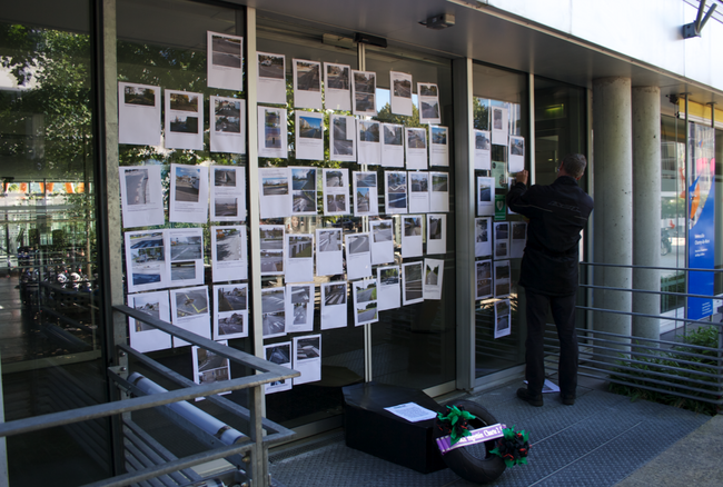 Un cercueil contenant la Charte et une couronne mortuaire (un vieux pneu de scooter) ont été déposés devant la porte d’entrée du siège de Nantes Métropole.