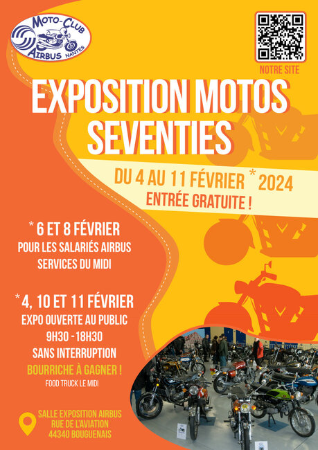 Entrée gratuite à notre exposition « Motos des Seventies » samedi 10 et dimanche 11 février de 9h30 à 18h30 salle exposition du CSE AIRBUS Nantes rue de l’Aviation 44340 Bouguenais (site AIRBUS Nantes Atlantic).