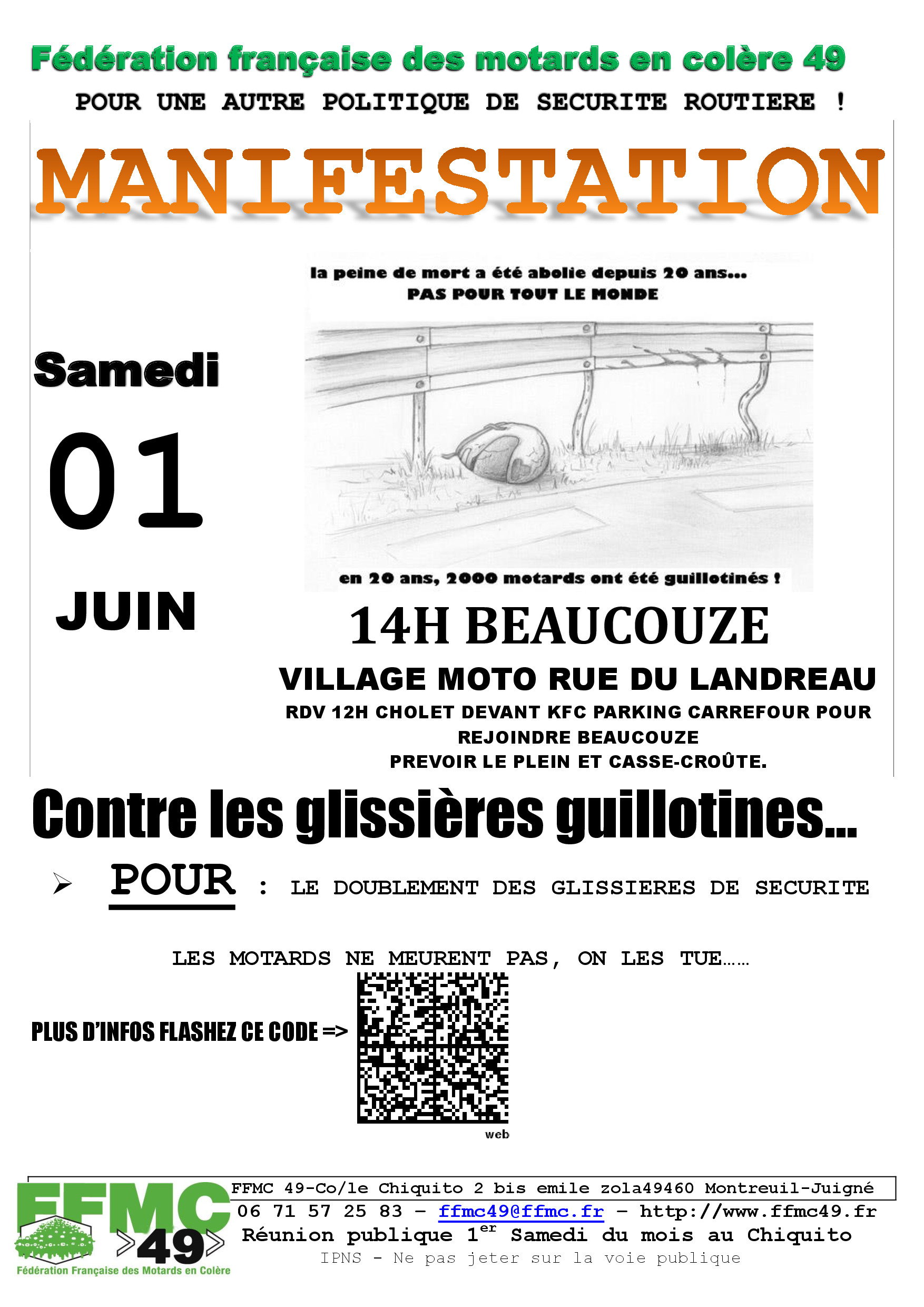 FFMC 49 - Manifestation pour le doublement des glissières de sécurité, samedi 1er juin à 14H00 à Beaucouzé (49)