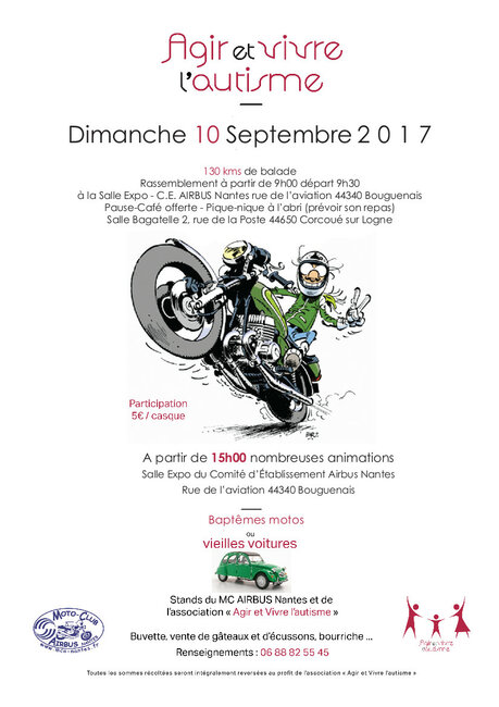 Le moto-club AIRBUS Nantes organise une journée caritative le dimanche 10 septembre 2017 permettant de récolter des fonds pour des enfants autistes accueillis au centre ABA de Nantes. Ces fonds permettront d’apporter des aides non négligeables à une douzaine d’enfants autistes notamment des soins d’orthophonie et d’ergothérapie.