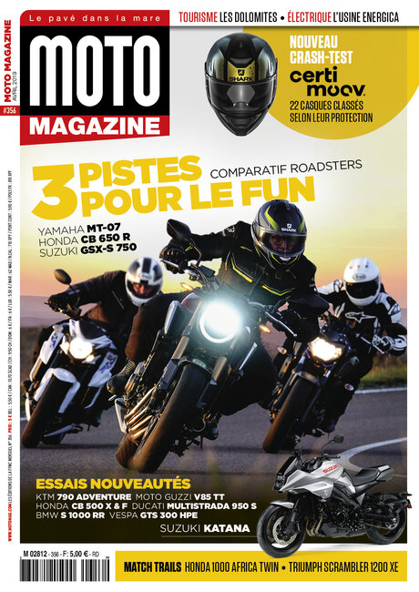 Ce numéro innove en publiant les résultats d’un nouveau crash-test de casques – 22 ont été mis à l’épreuve – qui tient compte de la rotation du cerveau. Ce protocole, Certimoov, est conduit par la Mutuelle des motards et vous en retrouverez régulièrement les résultats dans nos pages. Notre protection y gagnera à terme pour rouler en roadsters (notre comparatif), en trails (notre match) pour arpenter les Dolomites (notre voyage du mois) ou encore aller voir prochainement au Mans les Energica de MotoE dont nous avons visité l’usine.