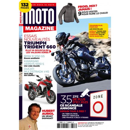 Vous y trouverez un hommage à Hubert Auriol, légende du Dakar qui vient de disparaître, le point sur la situation de Suzuki en France, un ultime tour d’horizon des nouveautés de l’année, les essais des nouvelles Triumph Trident 660, BMW R 1250 GS, Ducati Multistrada V4 S et Kawasaki 1000 S, plus un match entre deux motos néorétros, la BMW R nine T et la Ducati Scrambler 1100 Pro. Moto Magazine consacre également un gros dossier aux Zones à faibles émissions et leurs cohortes d’interdictions de circuler qui vont se multiplier partout dans l’Hexagone, sans oublier un grand test de sous-vestes pour avoir chaud l’hiver à moto. Côté sport, un portfolio revenant sur les “années Yamaha” officielles de Valentino Rossi, une infographie consacrée aux 800 victoires de Honda en GP et une interrogation : Marc Marquez courra-t-il en MotoGP dès les début de la saison ?