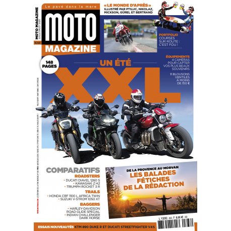 Le temps des vacances est arrivé et il est temps de s’évader à moto ! Voici donc un numéro XXL avec pas moins de trois comparatifs, roadsters, trails et baggers, les itinéraires fétiches de la rédaction pour traverser la France, ainsi qu’un test de 11 blousons aérés et de 4 caméras d’action. Et pour égayer vos haltes, on vous invite dans le « monde d’après » avec nos dessinateurs préférés, à savourer un portfolio de spectaculaires courses sur route et à plancher sur notre page « jeux de l’été » (...)