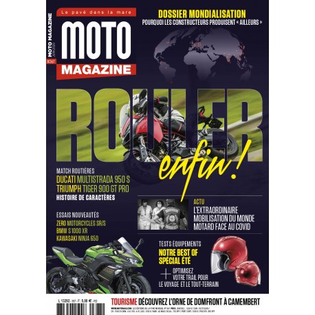 Profitons du déconfinement pour rouler et ne boudons surtout pas notre plaisir à l’heure où notre rayon d’action n’est plus limité à 100 km. Ce mois-ci, une balade dans l’Orne, l’essai de motos routières, d’une sportive électrique et d’une ancienne gloire, la Kawasaki GPZ 900 R. Mais aussi un gros dossier qui décortique le choix des constructeurs d’éventuellement produire ailleurs que dans leur propre pays, un sujet technique sur leur partie-cycle et nos habituels tests d’équipements.