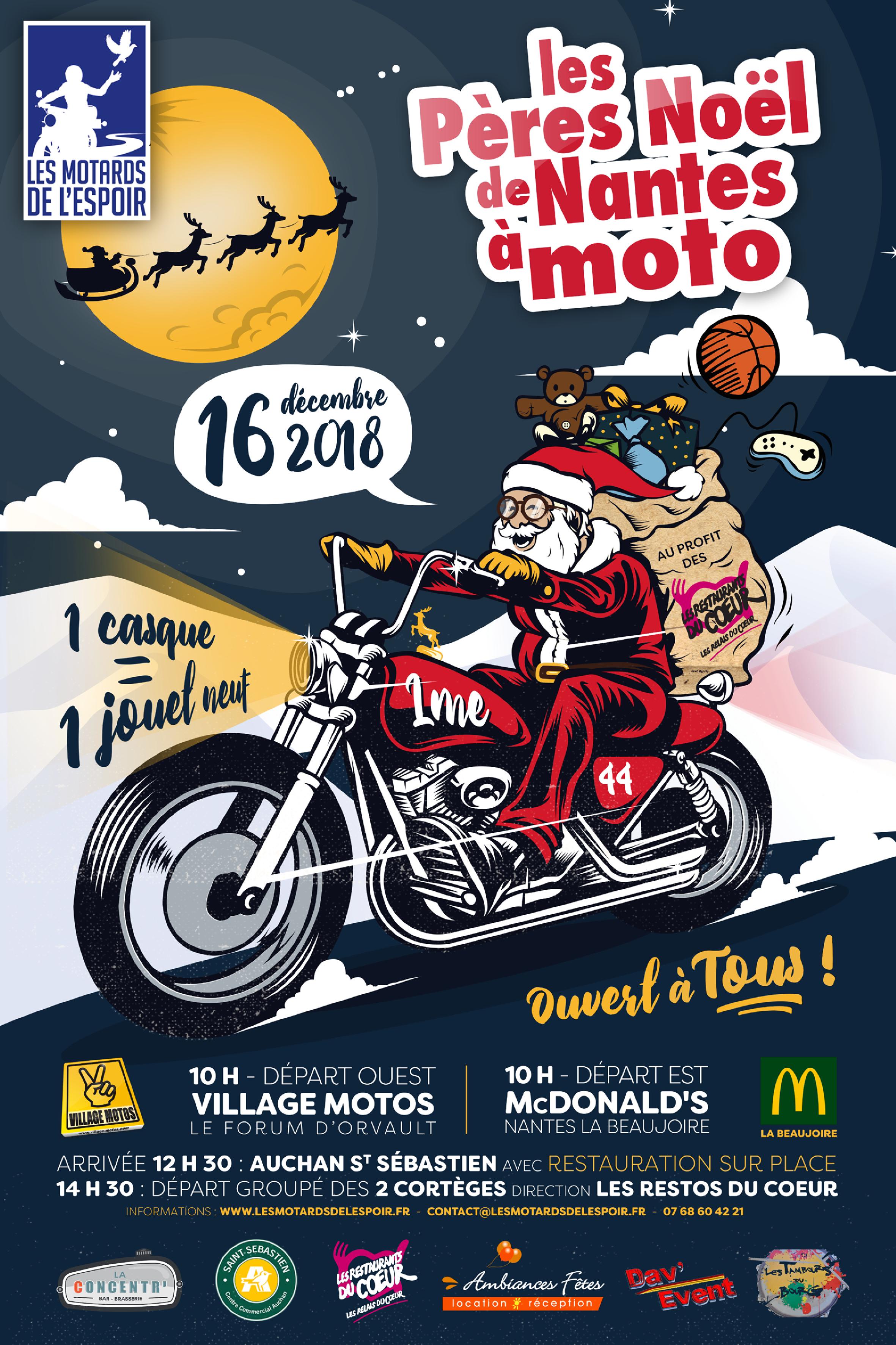 Le dimanche 16 décembre prochain, 2 cortèges de motardes et motards habillés en Père-Noël parcourront l’agglomération nantaise, le matin, avant de rejoindre le parking du AUCHAN Saint Sébastien pour la pause du midi. Les 2 cortèges se fondront ensuite en un seul qui repartira vers l’entrepôt des Restos du Coeur où une chaîne humaine motarde déposera le fruit de sa collecte en fin d’après-midi.