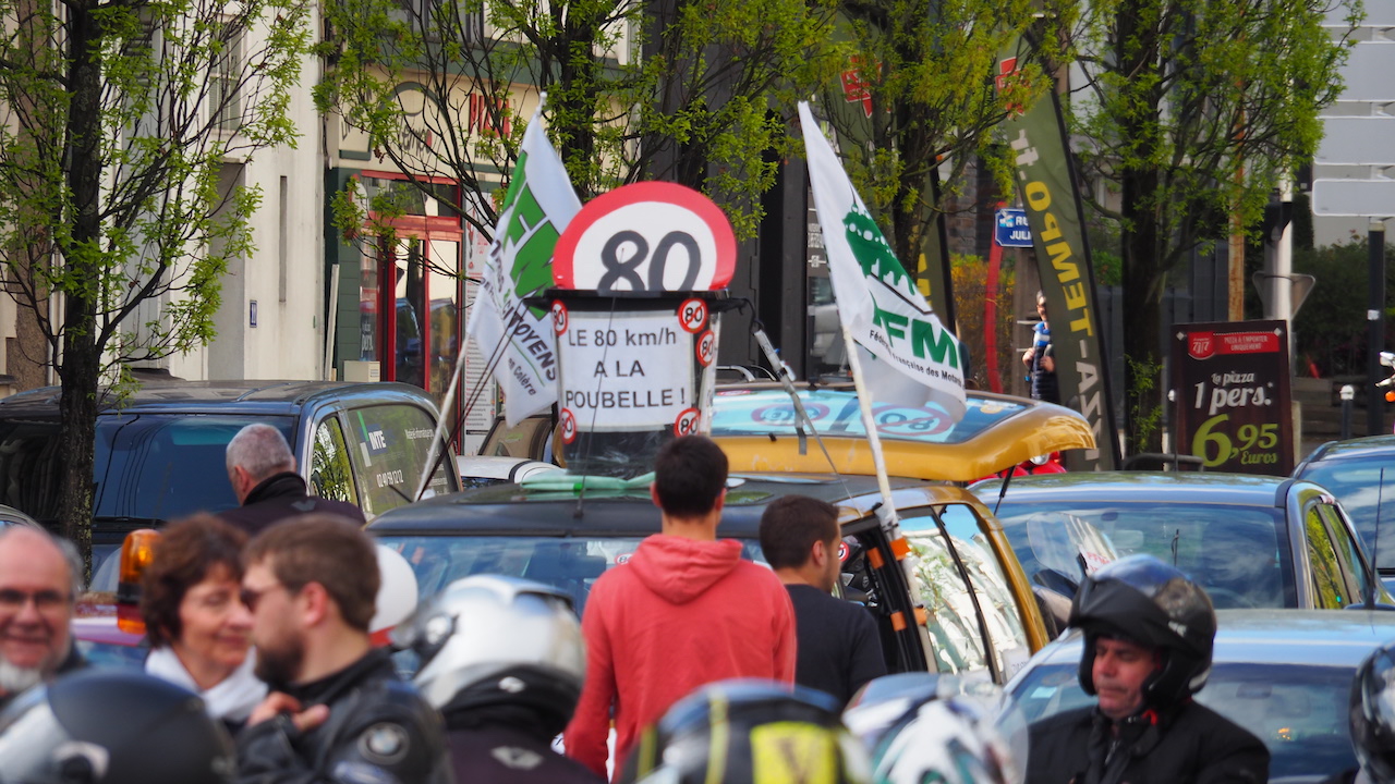 A l’appel de la Fédération Française des Motards en Colère de Loire-Atlantique (FFMC 44) et de 40 Millions d’Automobilistes, motards et automobilistes , se sont rassemblés une nouvelle fois rue Gaëtan Rondeau à Nantes en début d’après-midi pour dénoncer la baisse de la limitation de vitesse à 80 km/h (week-end d’actions nationales).