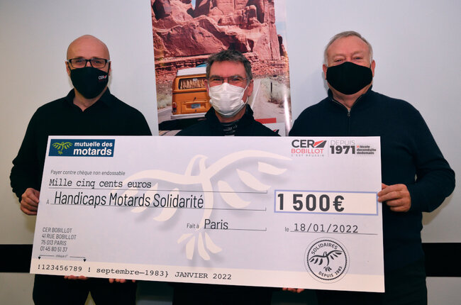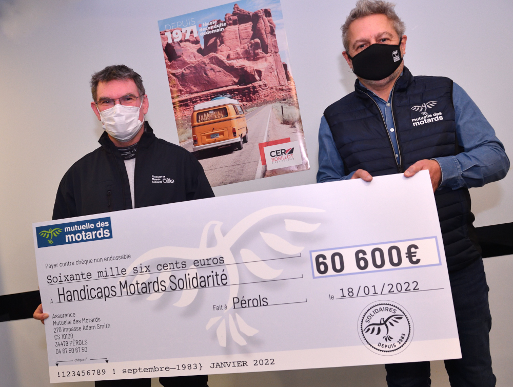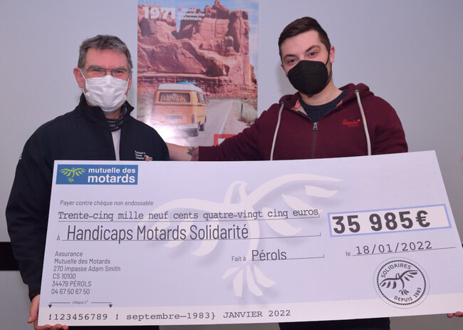 Grâce à vous, ce lundi 31 janvier 2022, l’Association Handicaps Motards Solidarité (HMS), dont la Mutuelle est partenaire depuis plus de 20 ans, s’est vue remettre deux chèques issus du Parrainage solidaire de ces deux dernières années.