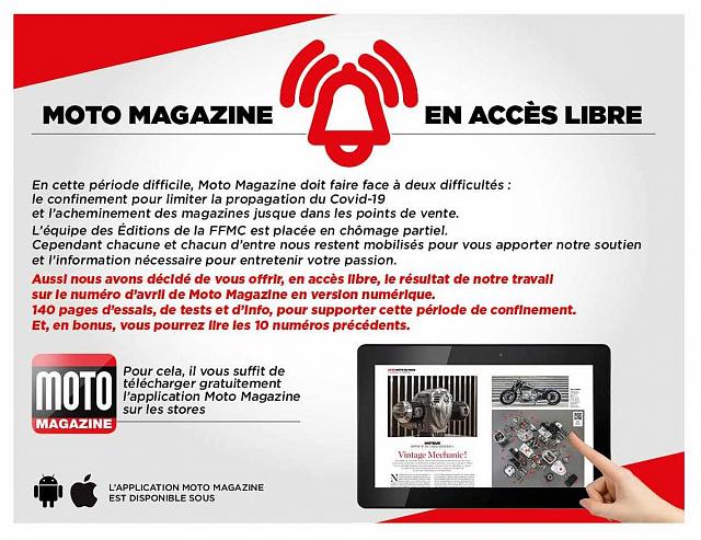 En cette période difficile, l’équipe de Moto Magazine, a décidé de soutenir les motardes et les motards dans leur confinement en leur faisant bénéficier gratuitement de la version numérique du N° d’Avril, ainsi que des 10 N° précédents. Il suffit pour l’obtenir de télécharger l’application Motomagazine !