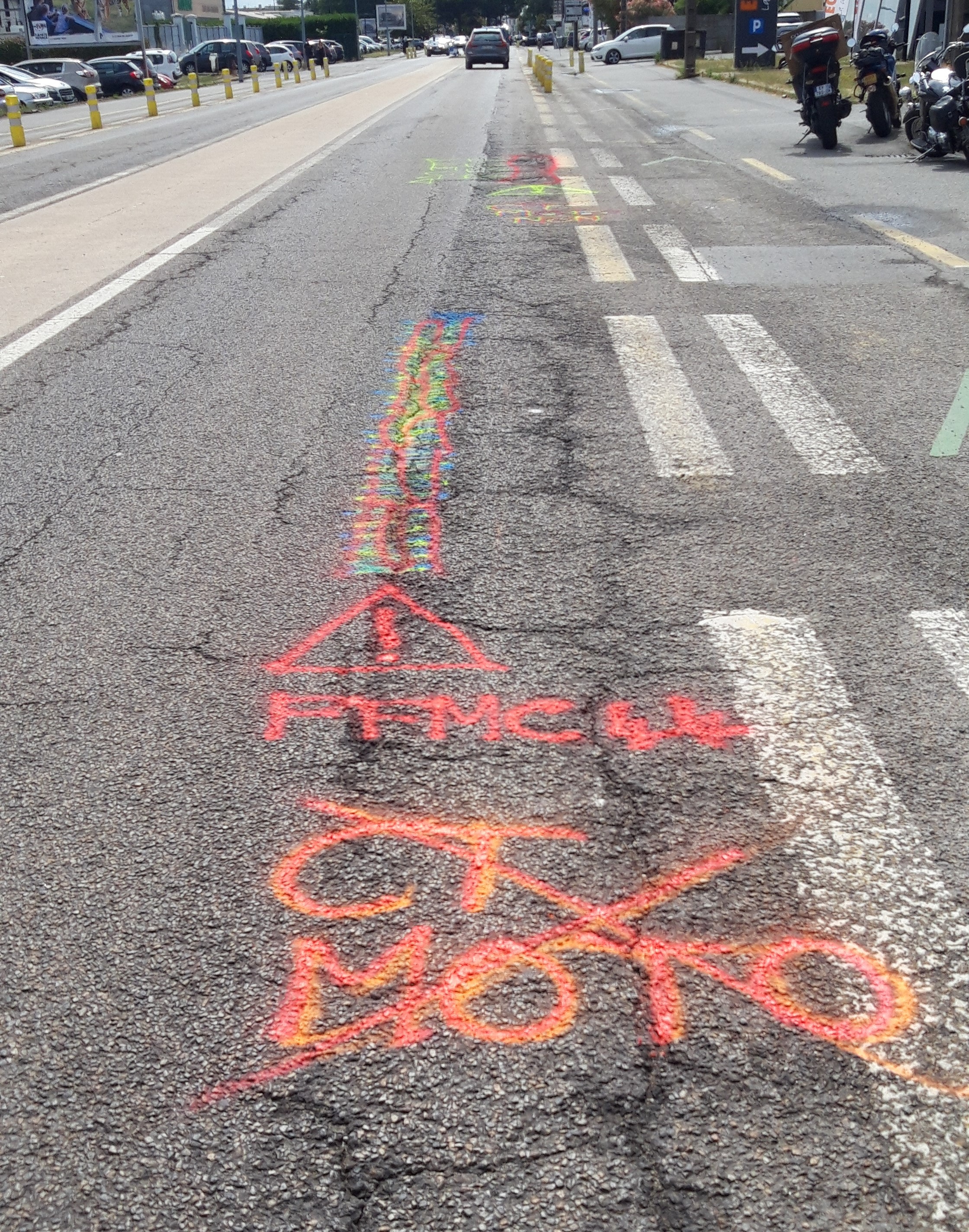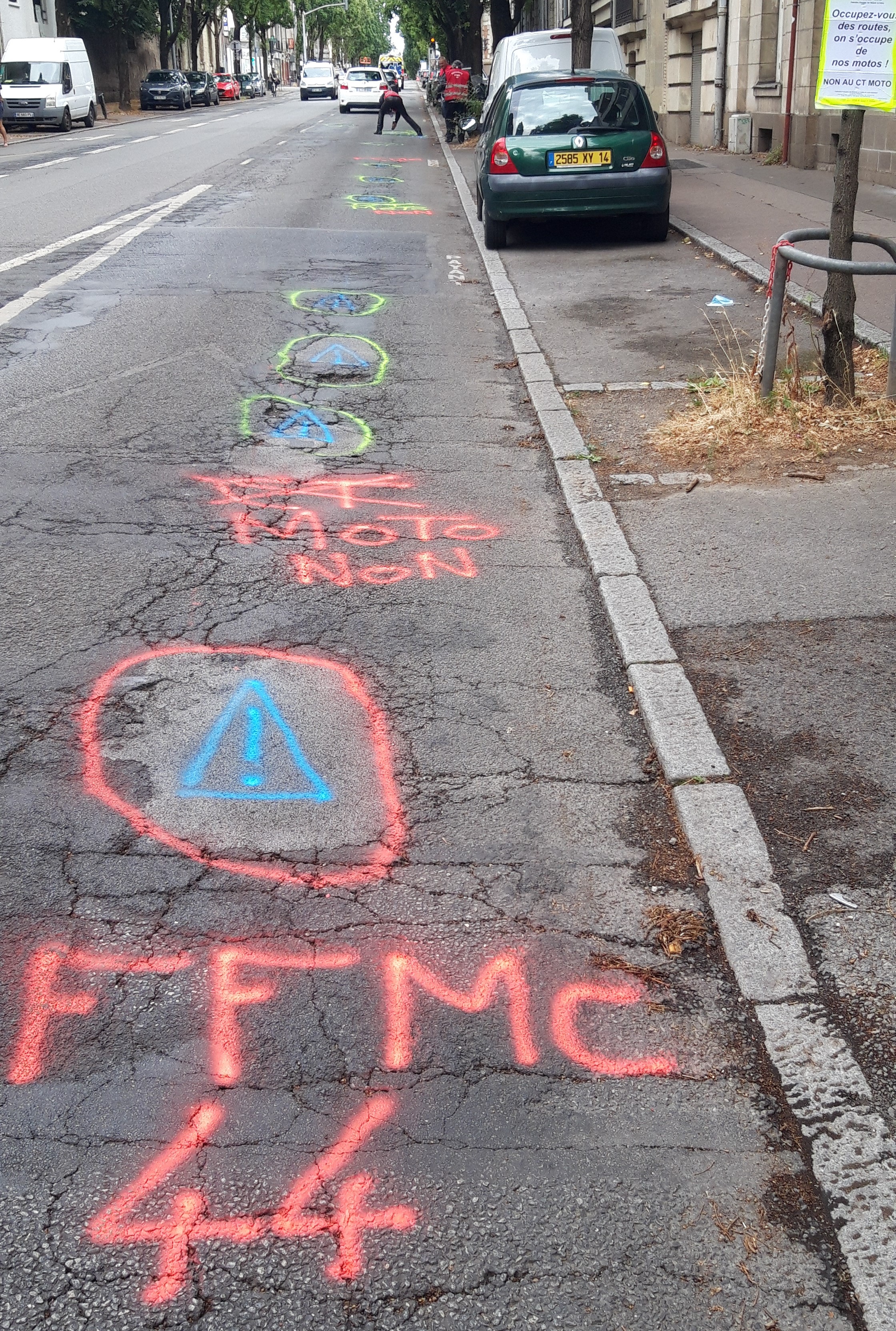 Samedi 08 juillet, 4 militants de la FFMC 44 ont signalé à la peinture des infrastructures dangereuses (nids-de-poules, chaussées fortement dégradées ou déformées, …) dans l’agglomération nantaise.