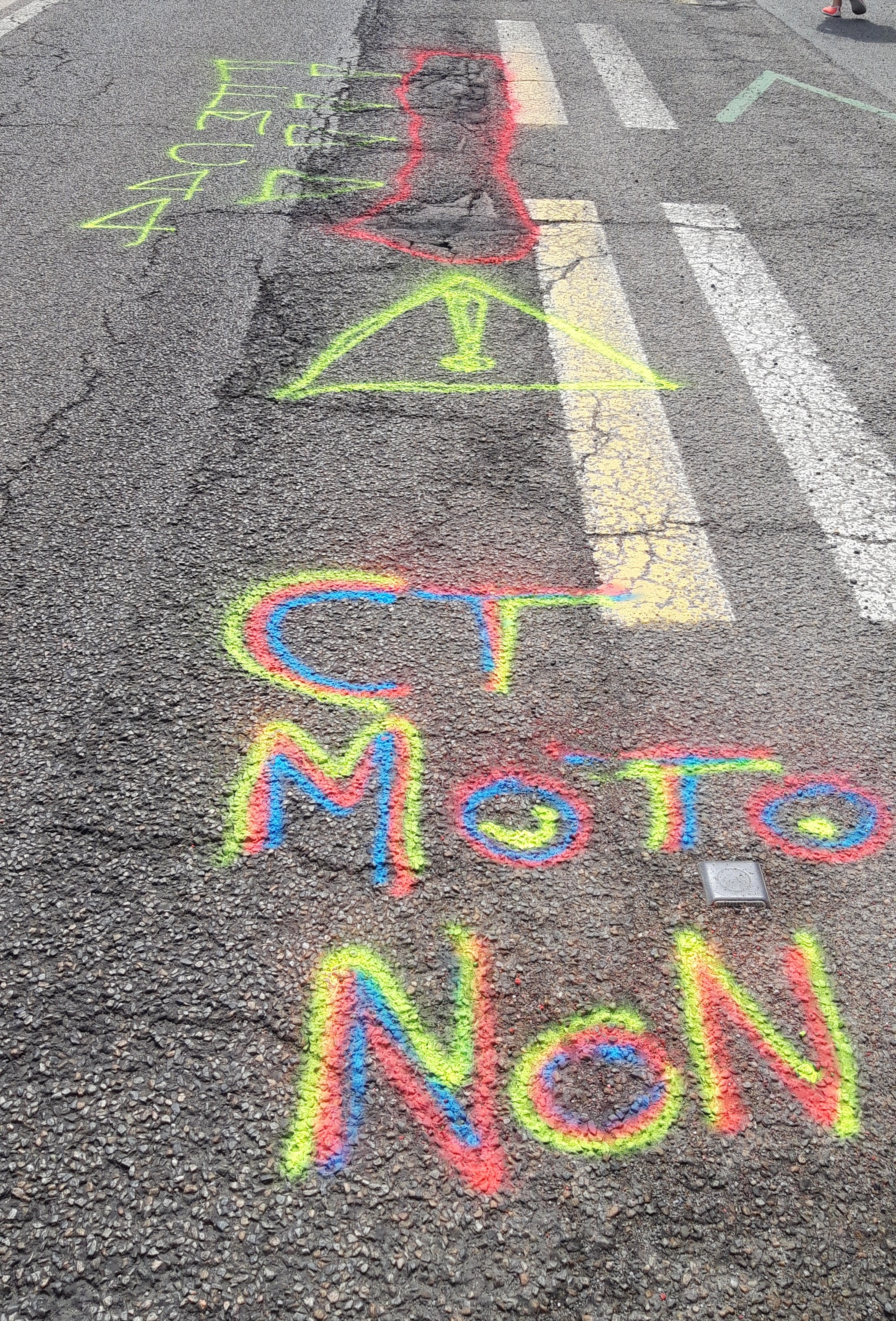 Entourer à la bombe l’infra en question. Dessiner un triangle de danger et écrire NON AU CT MOTO ou CT MOTO barré.