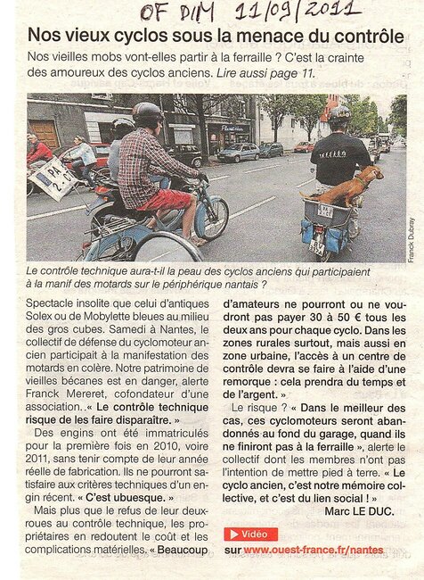 La samedi 10 septembre 2011, le collectif PA2CT (collectif de défense du cyclomoteur ancien) participe à la manifestation de la FFMC 44 à Nantes contre les mesures de Guéant ...
