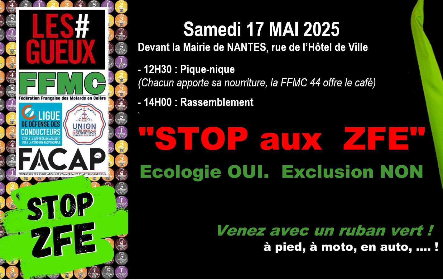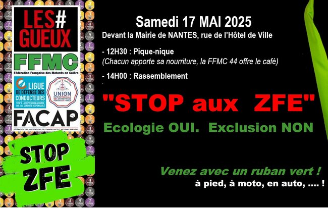 RAPPEL - Nouvelle mobilisation contre les Zones à Faible Emission (ZFE) samedi 17 mai 2025 devant la Mairie de NANTES, rue de l’Hôtel de Ville