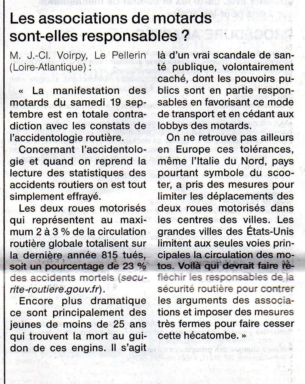 Ouest-France, dans son édition du 14 octobre 2015, a diffusé un courrier de M. Jean-Claude Voirpy habitant le Pellerin (44) intitulé « Les associations de motards sont-elles responsables ? ».