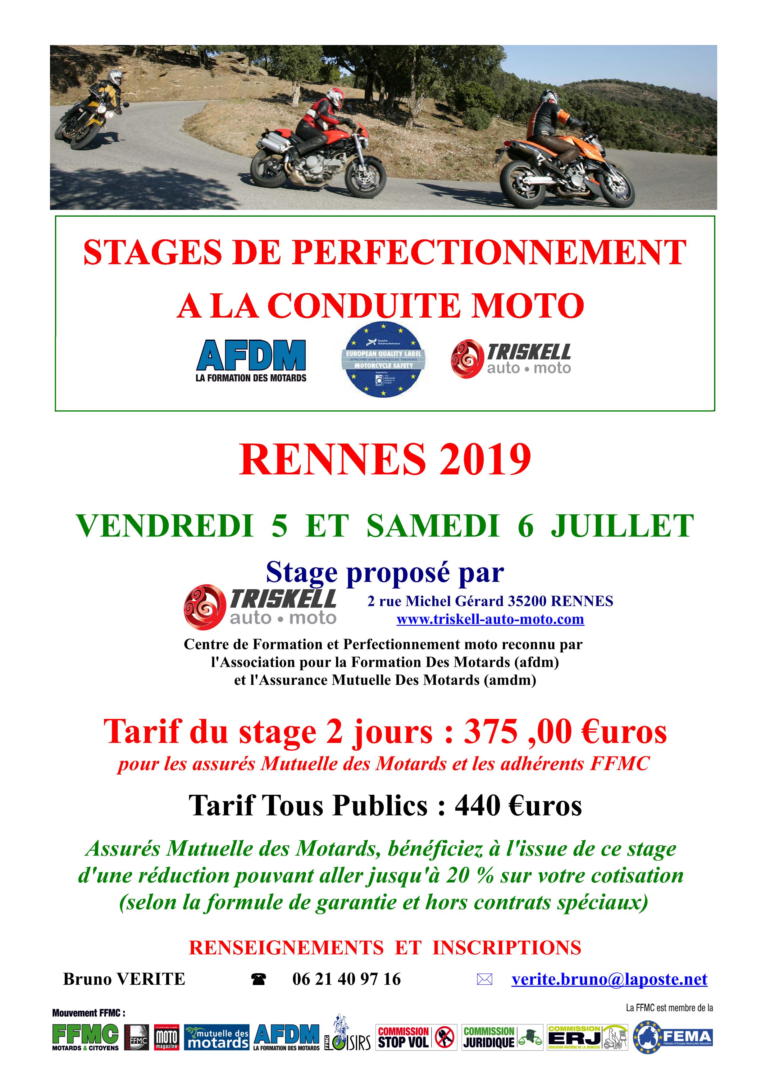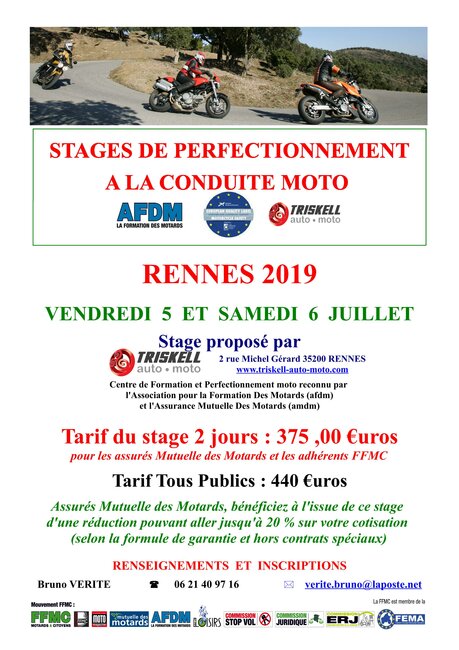 Stage perfectionnement moto AFDM TRISKELL à Rennes le 05 et 06 juillet 2019
