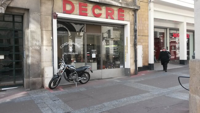 Cette moto a été verbalisée pour stationnement gênant. Elle gêne qui ? Elle n’entrave la circulation d’aucun piéton, poussette ou fauteuil roulant. Elle ne gêne encore moins le commerçant ; car c’est justement la moto du cordonnier. Ca fait plusieurs années qu’il se gare devant sa boutique sans gêner personne.