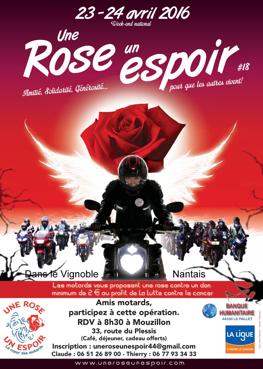 une "rose un espoir" manifestation humanitaire de MOTARD nouvelle sur la région, dont je suis l’organisateur. Le principe est simple : nous sillonnons le vignoble nantais ; -un(e) pilote et un passager(e), proposons une rose à la population locale contre un don minimum de 2€ (j’ai commandé 5000 roses). le bénéfice revient intégralement à la ligue contre le cancer pour lutter contre ce fléau.