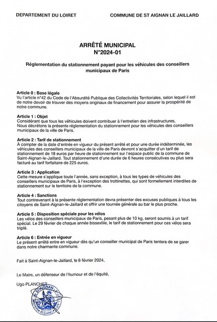Ugo Planchet se définit lui-même comme un "défenseur de l’humour et de l’équité". Vraisemblablement scandalisé par la votation actant le triplement du tarif du stationnement des SUV à Paris, le maire de Saint-Aignan-le-Jaillard, petite commune du Loiret située au sud-est d’Orléans, a décidé de "répondre à l’absurde par l’absurde".