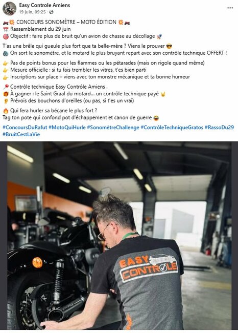 À Amiens, un contrôleur technique en activité organise littéralement un concours de décibels : "Viens faire hurler ta bécane, si ça fait trembler les vitres t’as peut-être gagné ton CT offert"
