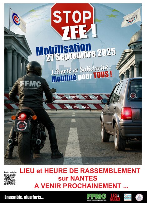 Samedi 27 septembre 2025, en association avec le collectif « Les # Gueux » et avec le soutien de nombreuses autres associations comme la LDC (Ligue de défense des conducteurs), la FFMC appelle à une mobilisation nationale des motards et de tous les usagers de la route contre les ZFE (Zones à faible émission).