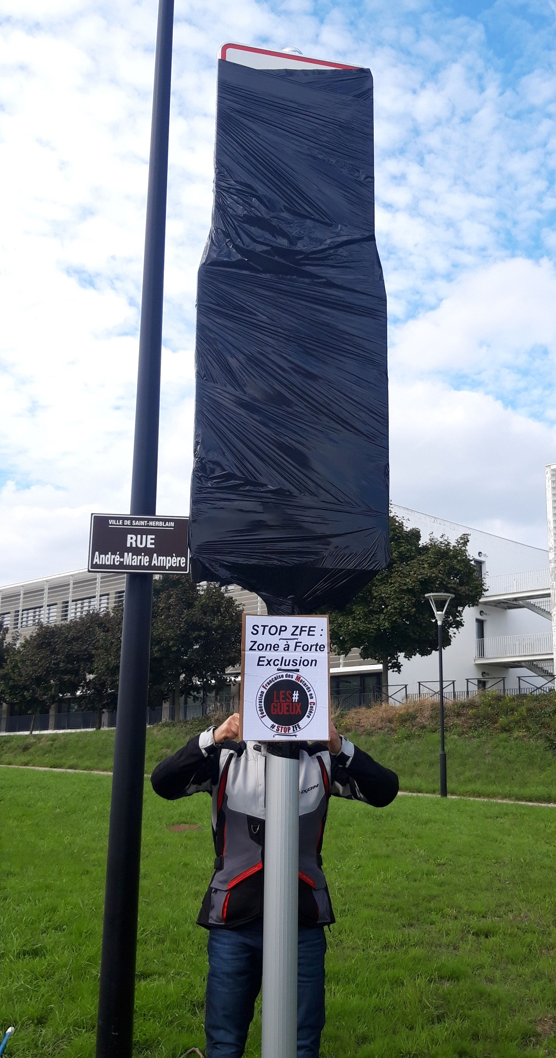 Samedi 27 septembre, manifestation démoniaque autour de Nantes où 15 panneaux d’entrée ZFE ont été filmés en noir. Moins de 5 minutes par panneau grâce à la technique développée et " brevetée " par la FFMC 44 !