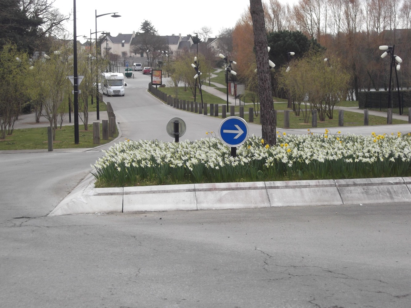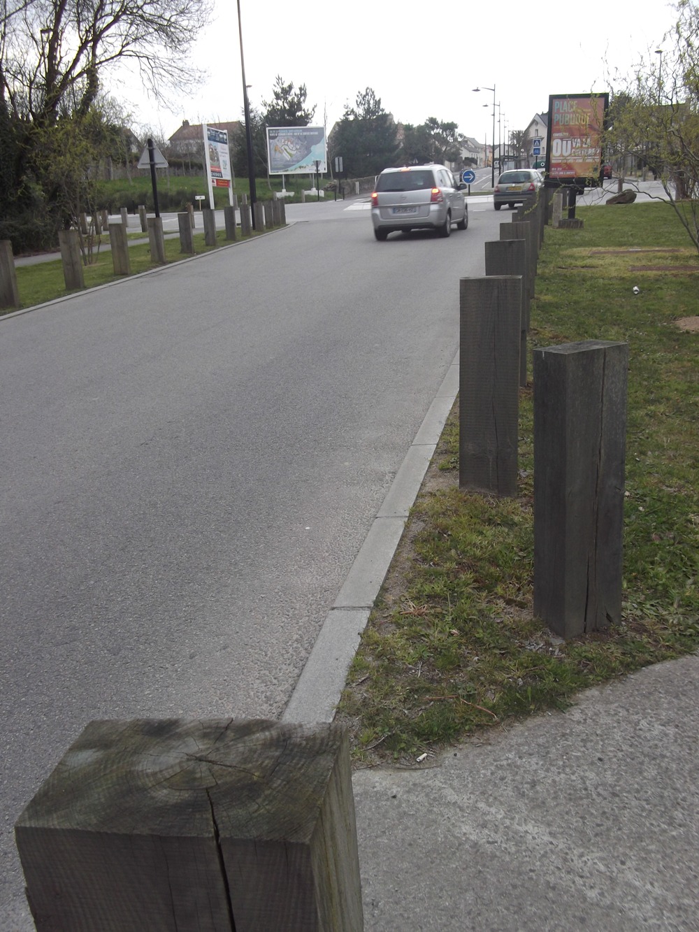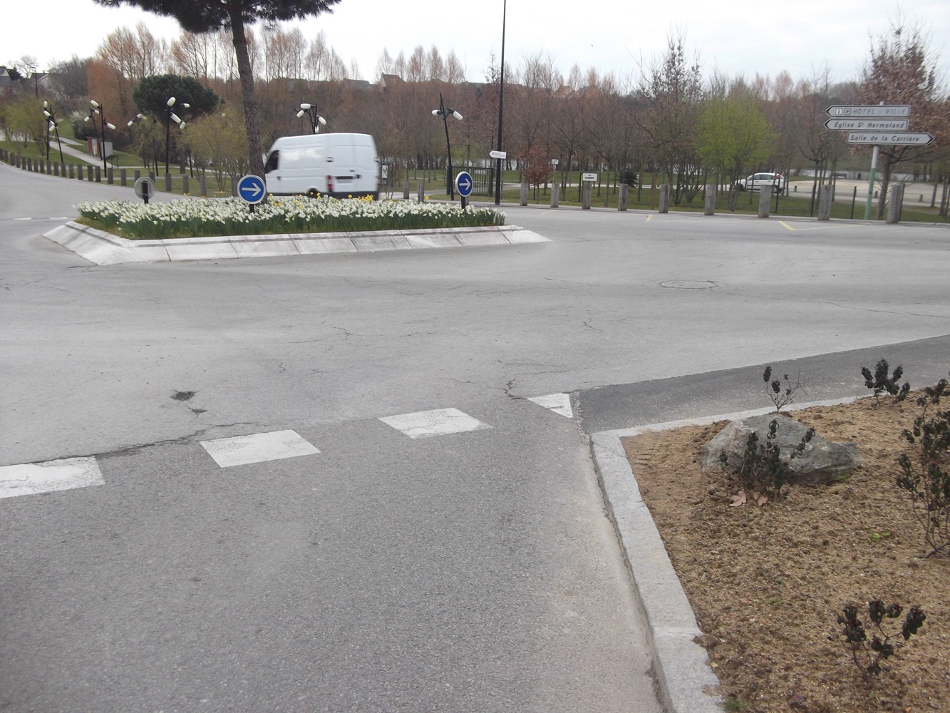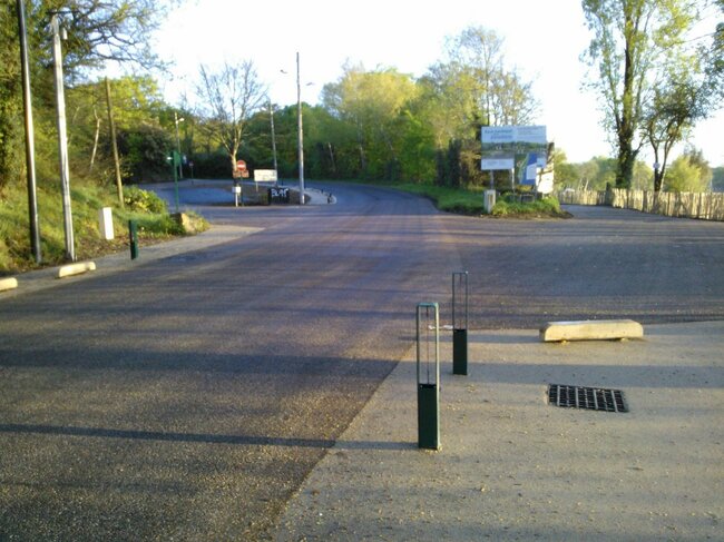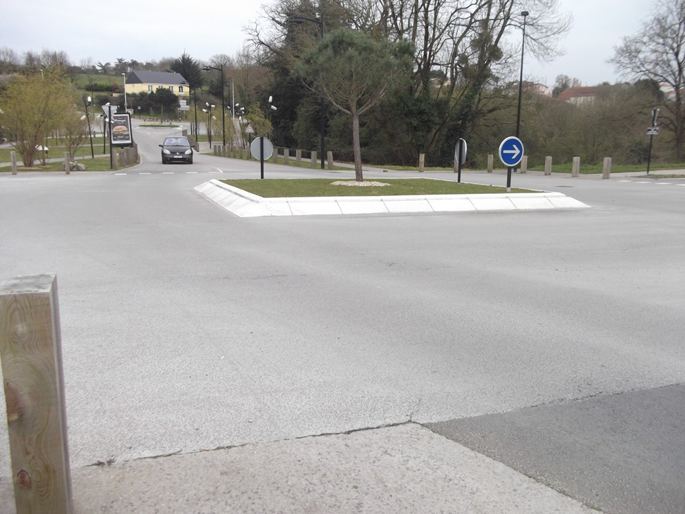 -> Malgré notre demande, une borne signalétique a été posée en avant du muret empiétant sur le giratoire !
