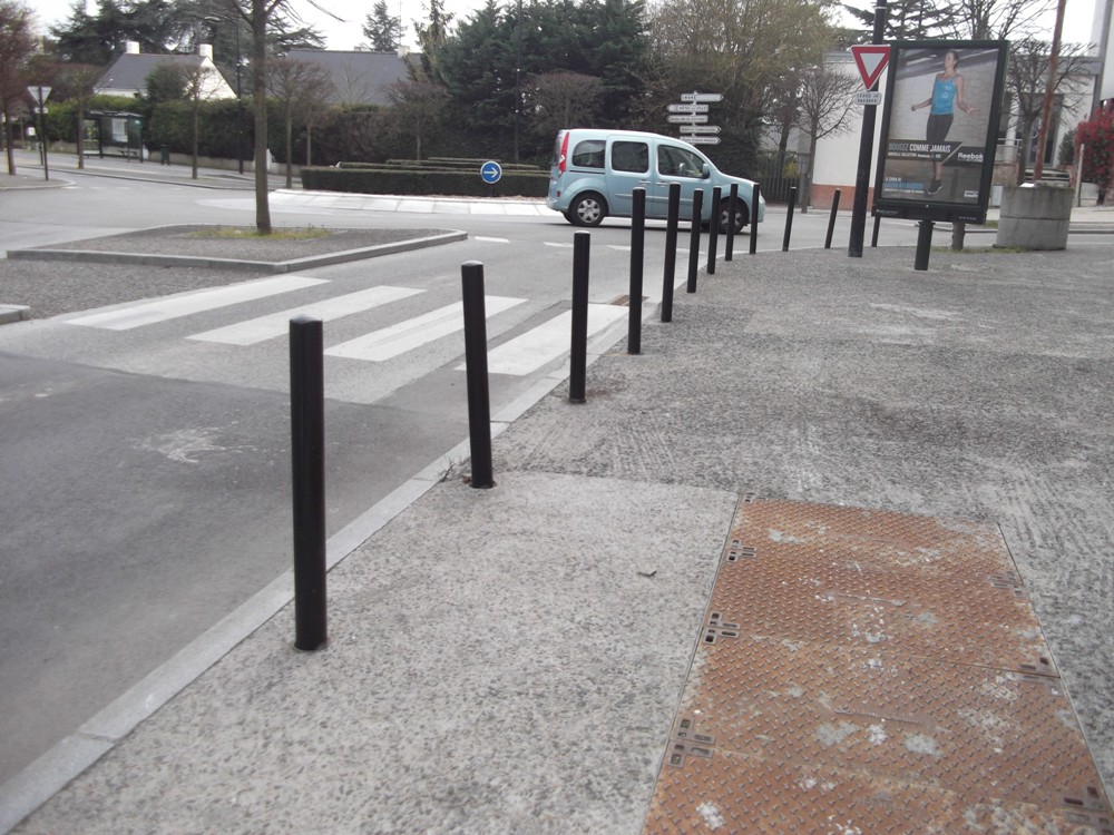 Quelle belle collection de potelets métalliques ! Interdiction de chuter ; empallage assuré ! Rue du Docteur Boubée et boulevard François Mitterrand à SAINT-HERBLAIN