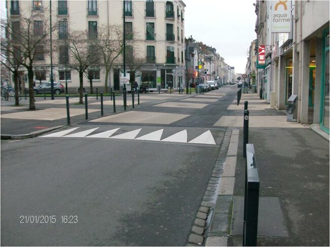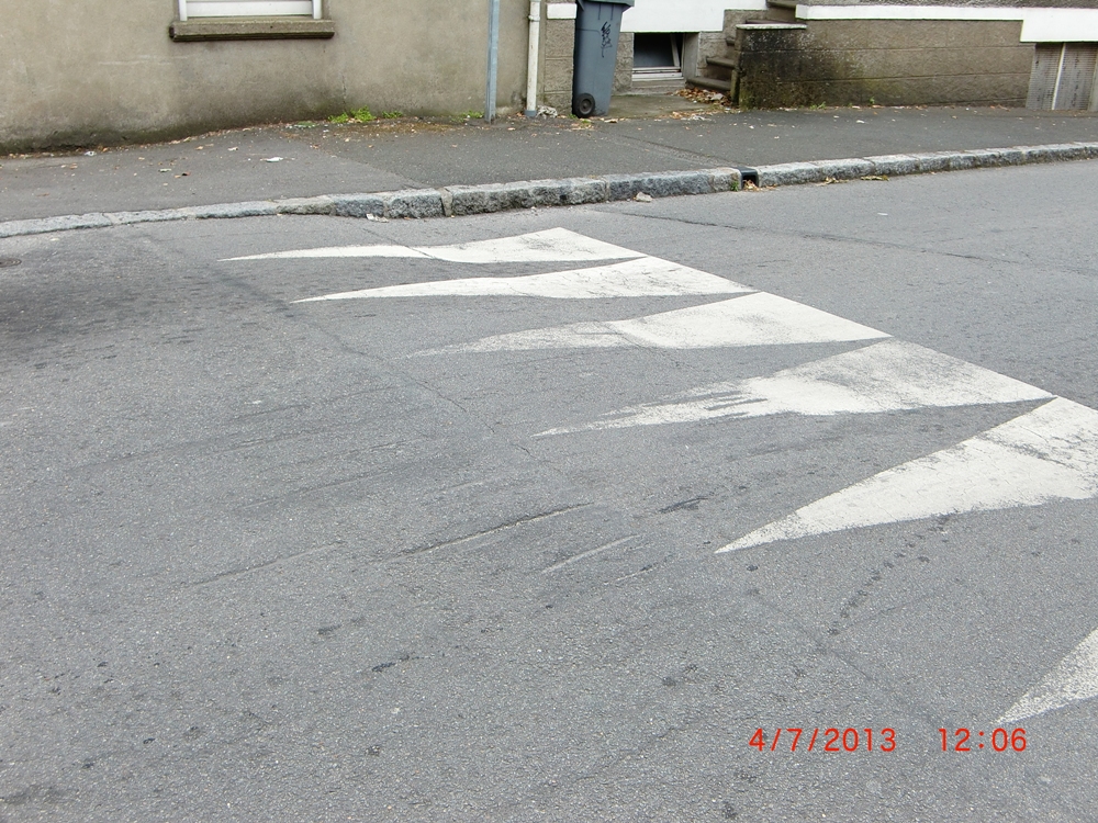 4 passages piétons dont la surélévation est importante, non signalés en entrée de voie et peu visibles sur une chaussée dégradée - Rue de l’Olivraie à NANTES