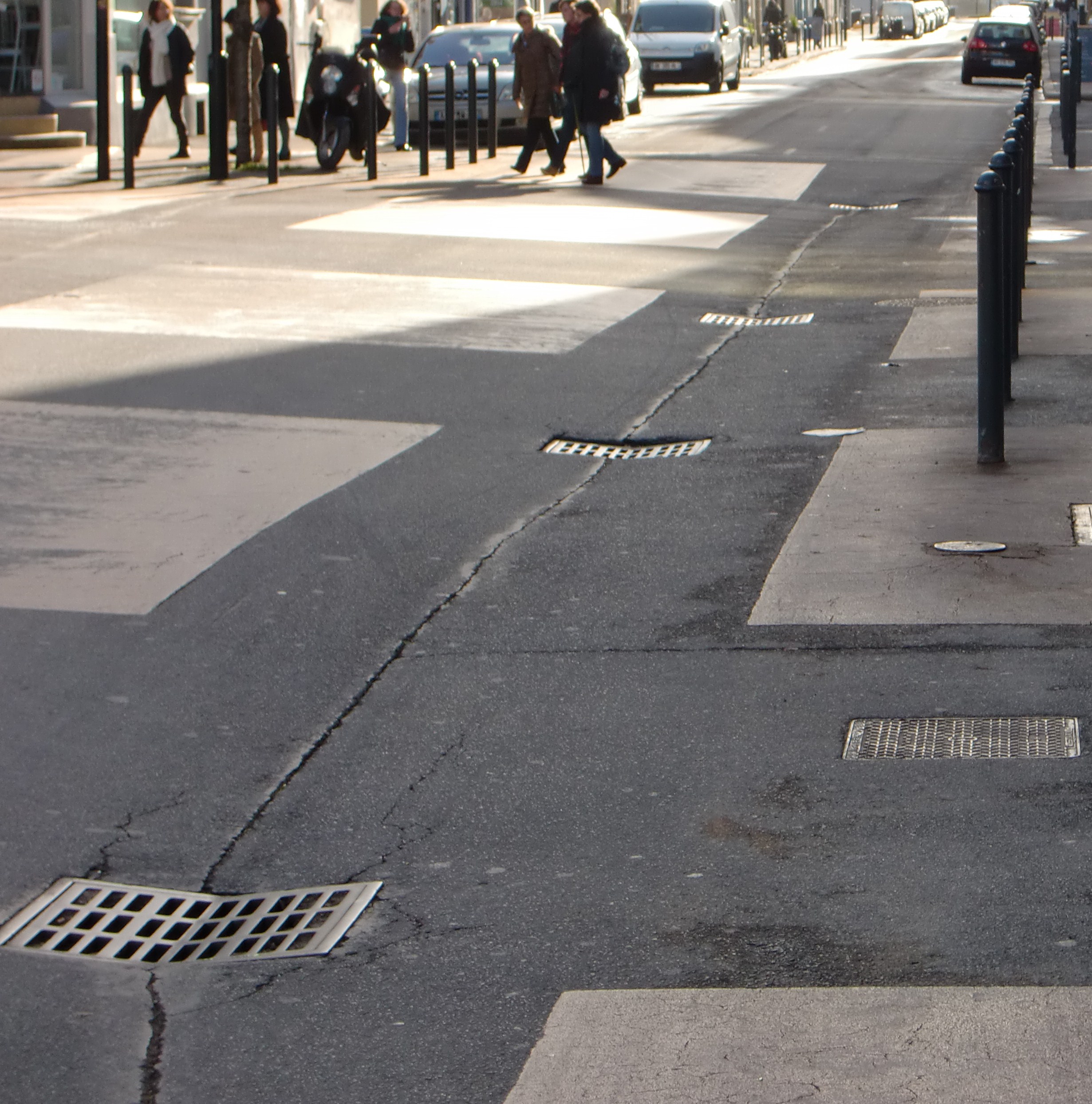 20 plaques d’égoût (plus ou moins endommagées) sur 200 m placées par 2 au milieu de la voie !