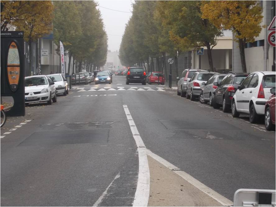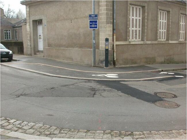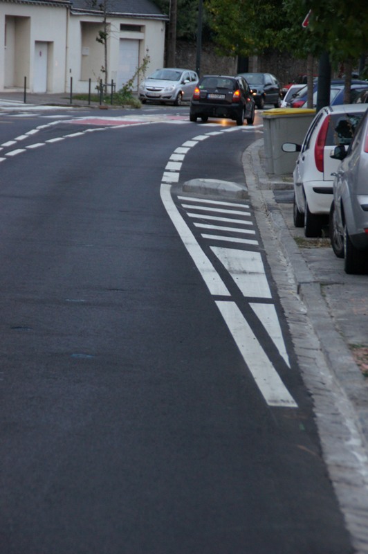 Une piste cyclable en contre sens à gauche (voie en sens unique) hors zone 30 km/h a été créé avec de nombreuses masses blanches peu visibles.