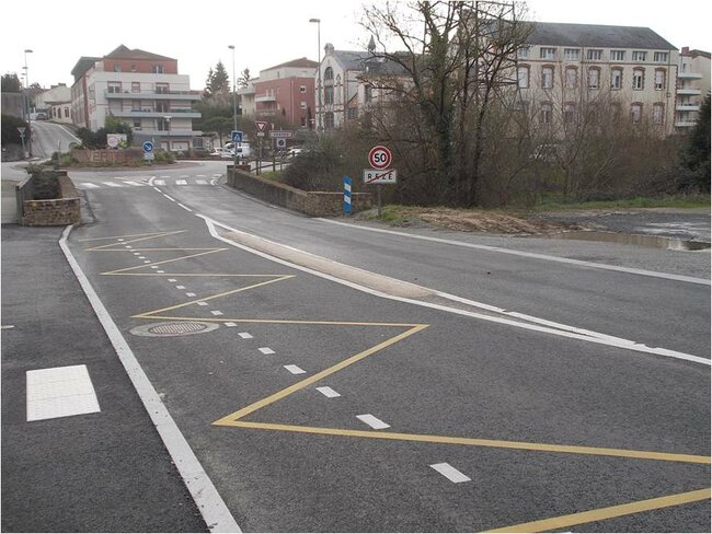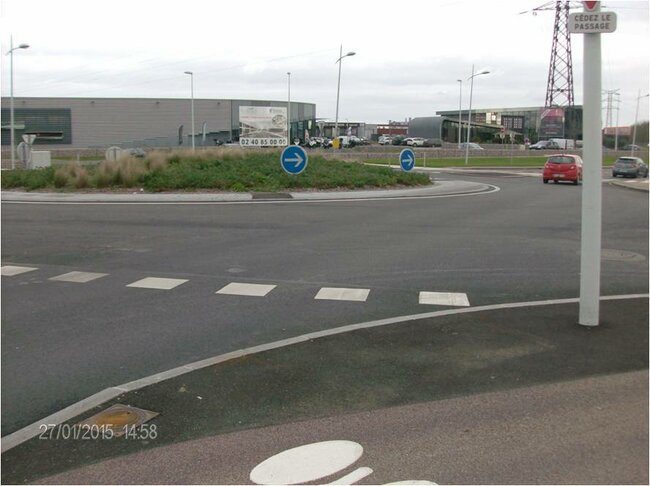 Commentaire de la FFMC 44 : l’utilisation de la même signalétique pour les pistes en bordure et les pistes en centre de giratoire est source de confusion et est non-conforme au code de la route qui indique que les véhicules à moteur ne doivent pas rouler sur les pistes cyclables !